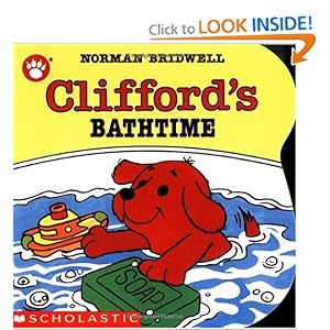 Story: Clifford's Bathtime board book Bridwell. I put our giant Clifford the Big Red Dog center stage and could act out the book, scrubbing him, giving him his rubber duckie, toweling him off.